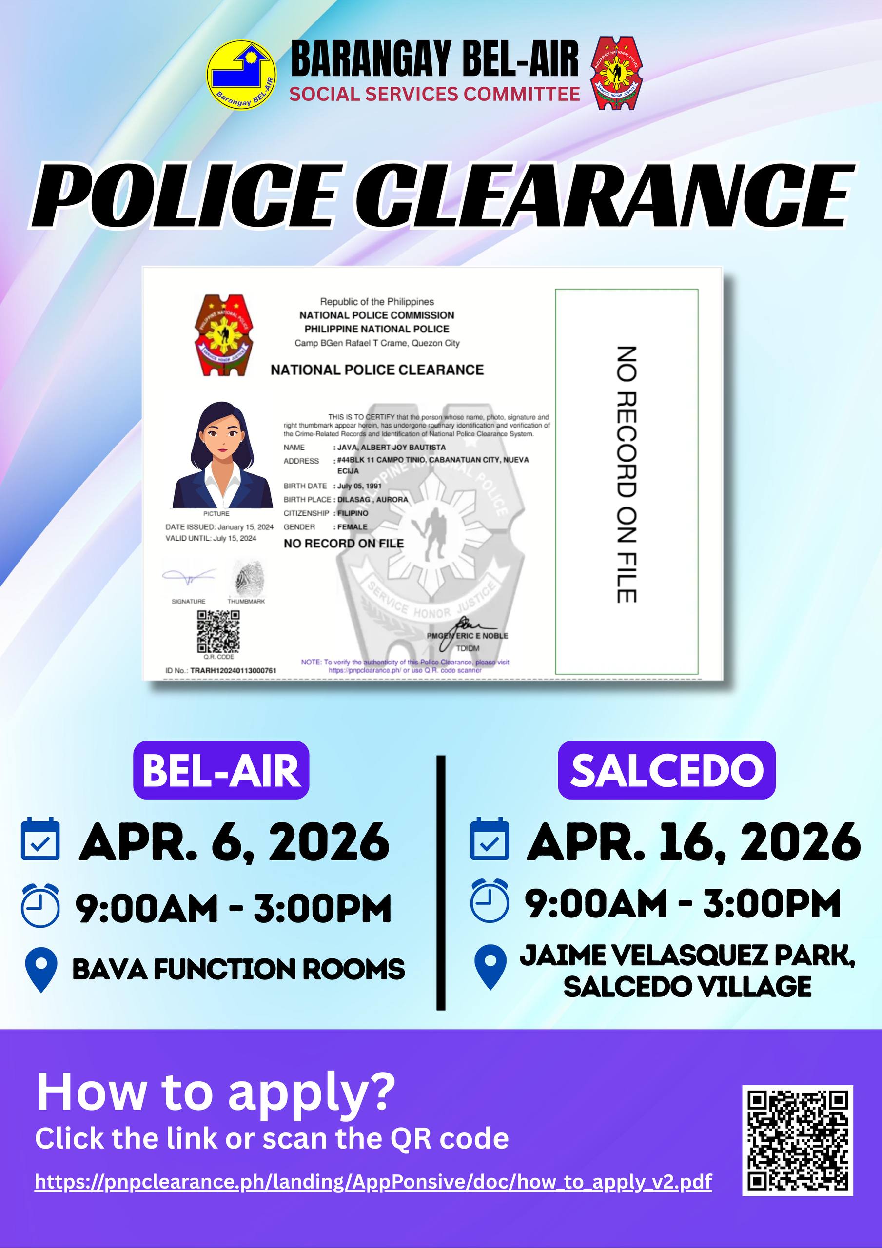 Clear your schedule, clear your name! Get your Police Clearance this April 6 at the Bel-Air Multi-Purpose Covered Court. Donโt forget to click the link or scan the QR code and follow the instructions.